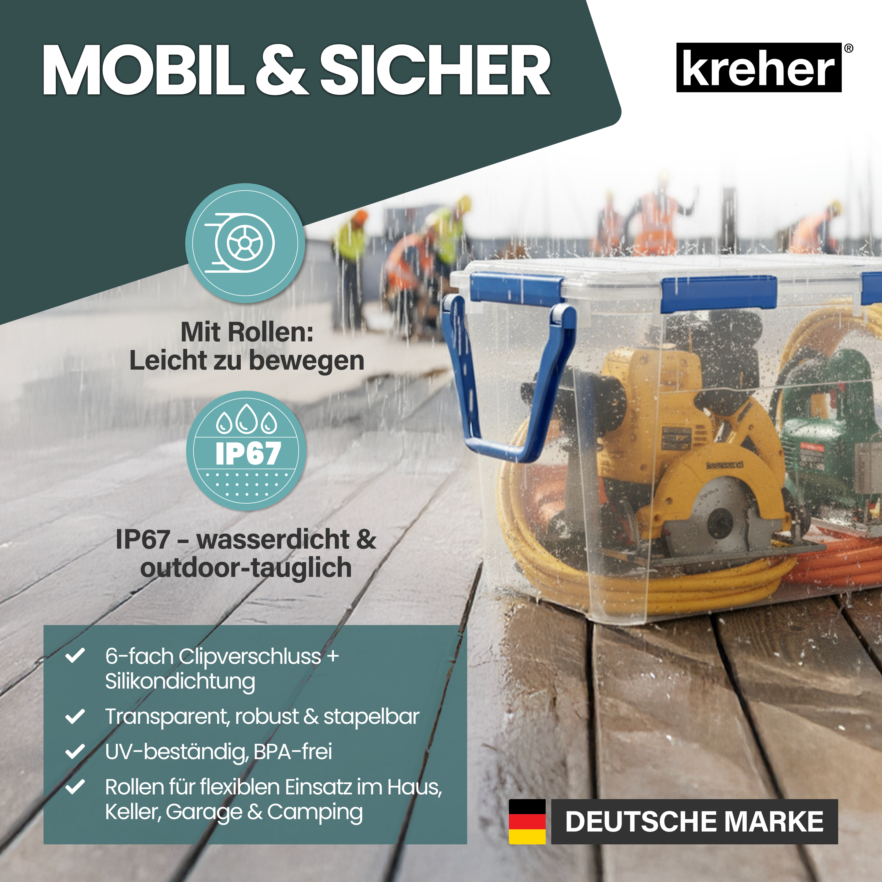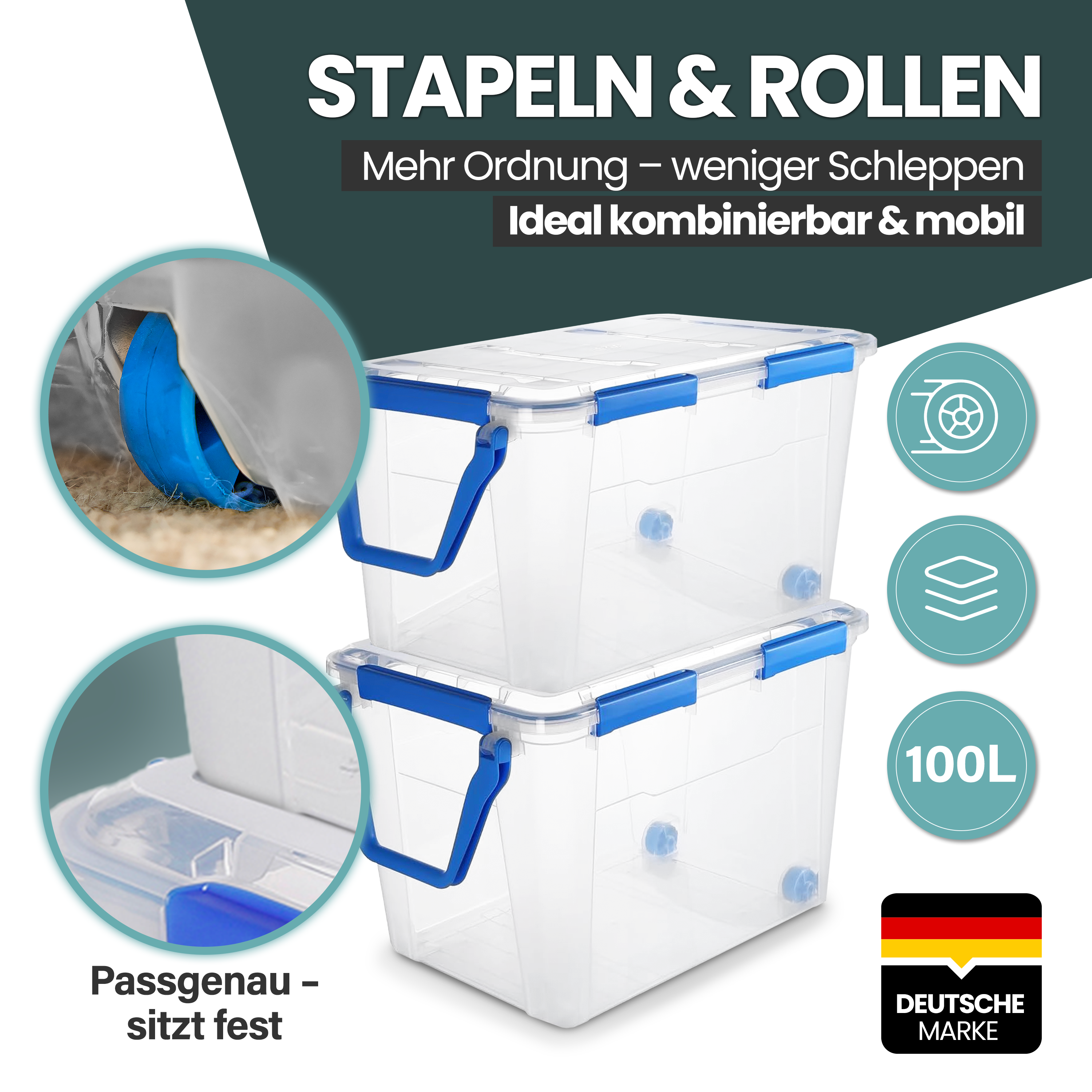 Wasserdichte Aufbewahrungsbox Rollbox mit Deckel | Außenmaße (BxTxH): 66 x 46,9 x 45,9 cm | Innenmaße (BxTxH): 61 x 41,5 x 40,5 cm | Volumen: 100 Liter | Material: Robuster Kunststoff (BPA-frei) mit präziser Silikondichtung | Farbe: Transparent mit blauen Applikationen | IP67 zertifiziert: absolut wasserdicht und staubdicht | UV-resistent: kein Vergilben oder Verspröden | Stapelbar: platzsparend und sicher übereinander lagerbar | abnehmbarer Deckel mit integrierter Dichtung | Breite, ergonomische Druckverschlüsse | Pflegehinweis: Einfach mit einem weichen, feuchten Tuch und mildem Reinigungsmittel abwischen