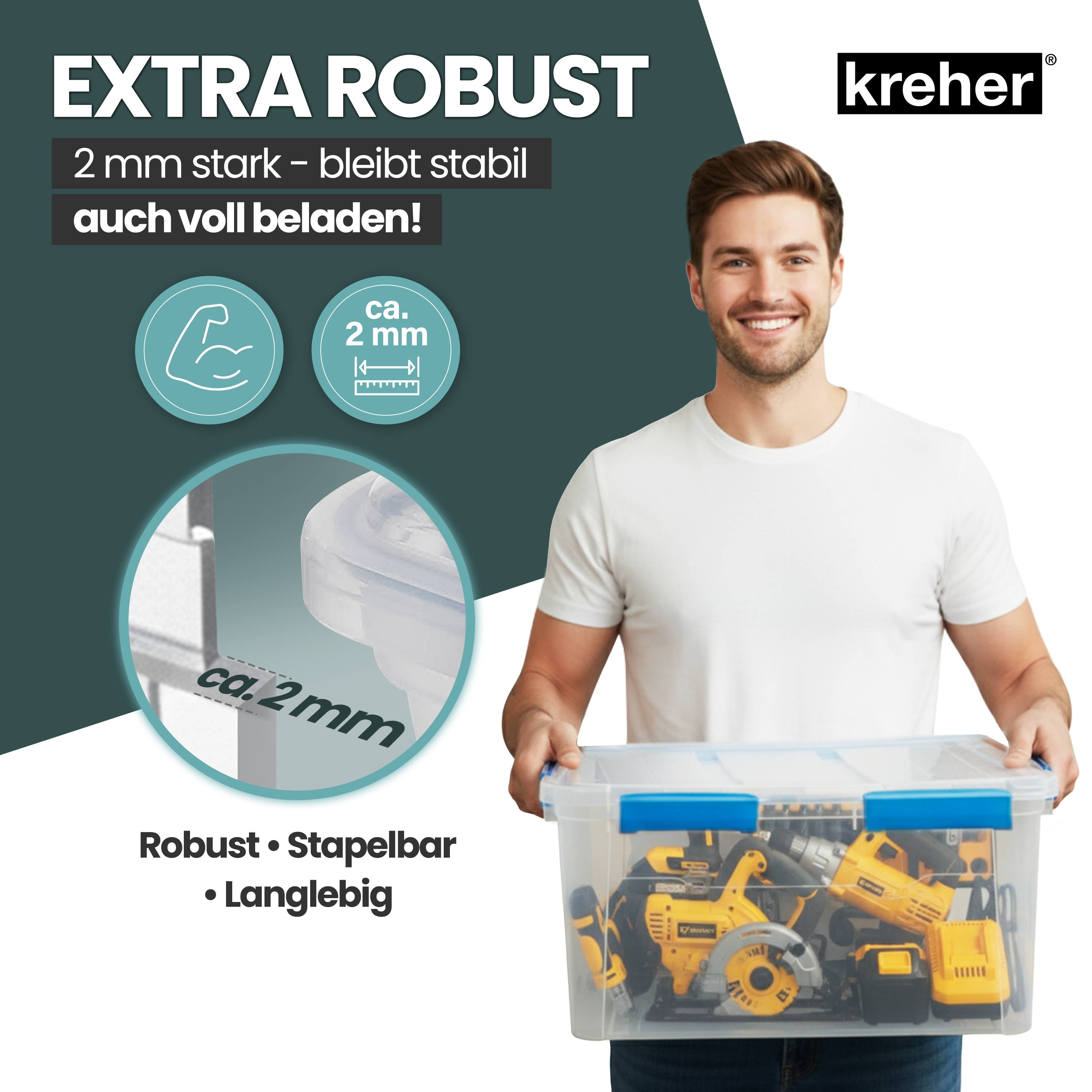 Dank stabiler Konstruktion und integrierter Stapelleisten lassen sich mehrere Boxen sicher übereinander lagern. Ob im Keller, in der Garage, im Gartenhaus oder auf dem Campingplatz - schaffen Sie im Handumdrehen Ordnung für Werkzeuge, Ausrüstung, Textilien und Saisonartikel.