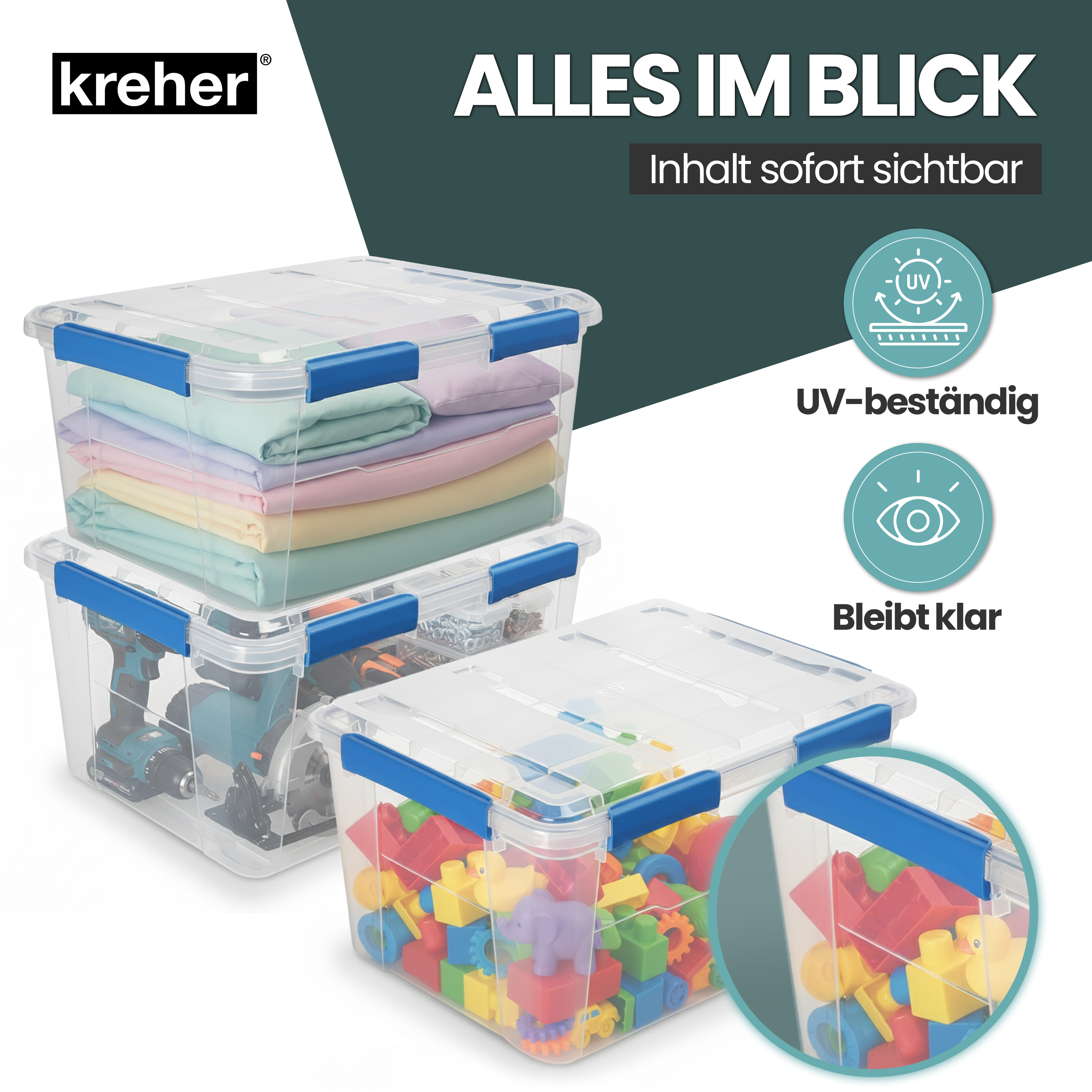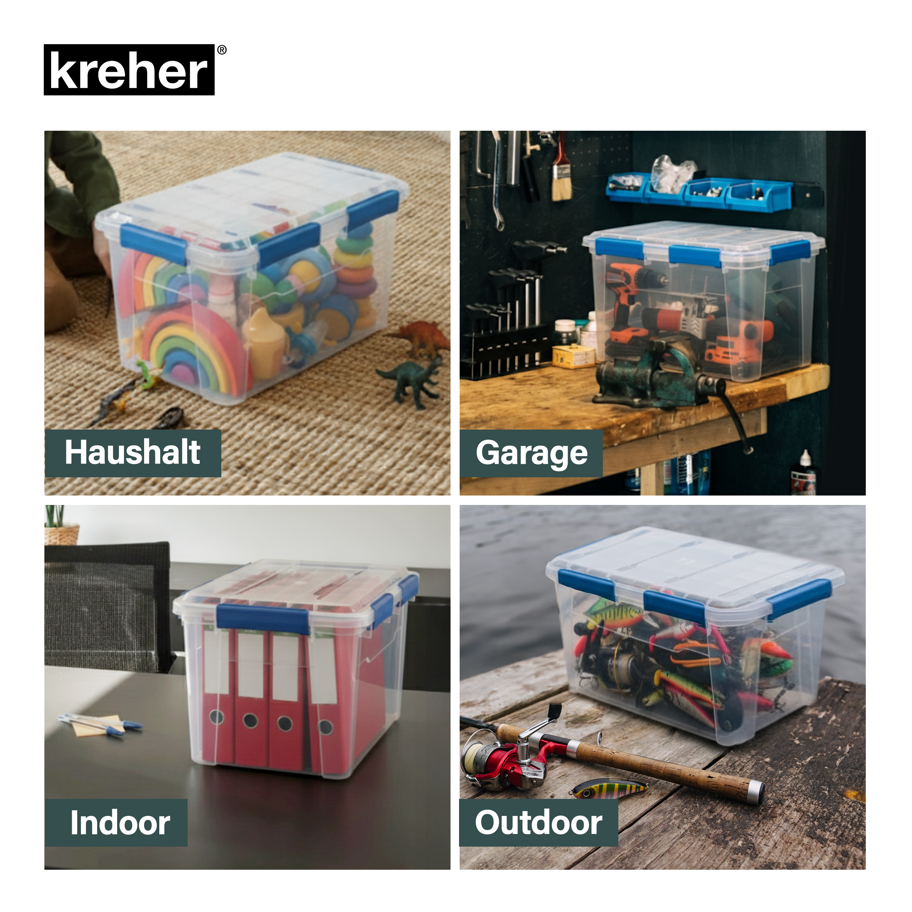 Kreher® Wasserdichte Aufbewahrungsbox mit Deckel | Praktisches 2er oder 4er Set | Außenmaße (BxTxH): 64 x 47 x 33,3 cm | Innenmaße (BxTxH): 60 x 43 x 29 cm | Volumen: 75 Liter | Material: Robuster Kunststoff (BPA-frei) mit präziser Silikondichtung | Farbe: Transparent mit blauen Applikationen | IP67 zertifiziert: absolut wasserdicht und staubdicht | UV-resistent: kein Vergilben oder Verspröden | Stapelbar: platzsparend und sicher übereinander lagerbar | Abnehmbarer Deckel mit integrierter Dichtung | Breite, ergonomische Druckverschlüsse | Pflegehinweis: Einfach mit einem weichen, feuchten Tuch und mildem Reinigungsmittel abwischen