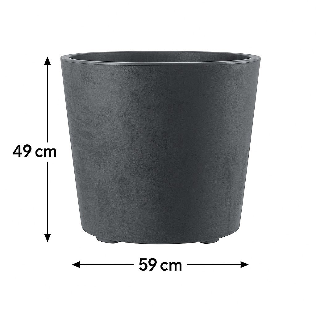 Kreher XXL Blumentopf Millennium | Volumen: ca. 80 Liter | Maße (ØxH) in cm ca.: 59 x 49 cm | Design: Naturstein-Optik | Ausstattung: Wasserspeicher, Entwässerungs-Loch am Boden mit Kappe, Rollen [optional zu montieren] | Finish: Matt | Farbe: Anthrazit, Braun, Grau oder Creme | Ausführung: Doppelwandig | Material: UV-geschützt, Frost-sicher, Kunststoff | Indoor & Outdoor