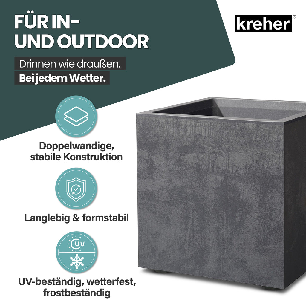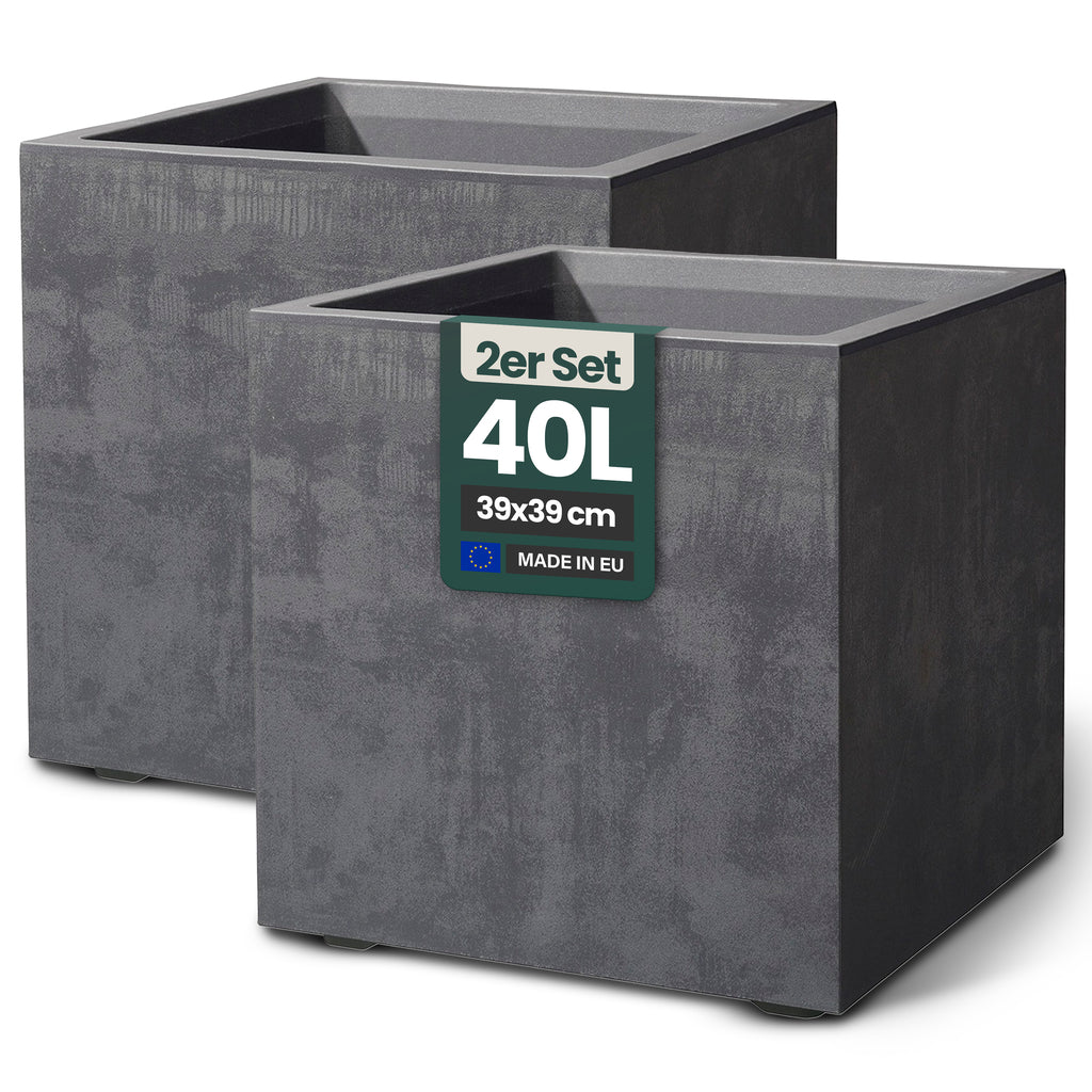Kreher Pflanzkübel 'Millennium' | Praktisches 2er Set | Maße 40 Liter Eckig (BxTxH): 39 x 39 x 39 cm | Mit Wasserspeicher & Entwässerungsstopfen | Material: UV-beständiger, frostsicherer Kunststoff | Für Indoor & Outdoor | Design: Naturstein-Optik | Farben: Anthrazit