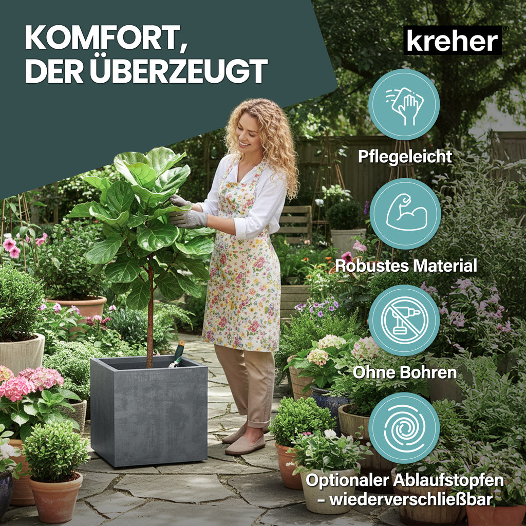 Der Kreher Pflanzkübel 'Millennium' vereint modernes Design mit durchdachter Funktionalität und ist die perfekte Wahl für Garten, Terrasse oder Balkon. Je nach Modell bietet er großzügige Pflanzvolumen von 40 bis 80 Litern – ideal für Blumen, Pflanzen, kleine Sträucher oder dekorative Arrangements.