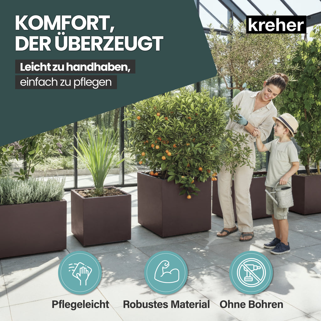 ELEGANTER PFLANZKÜBEL FÜR IHREN AUSSENBEREICH - Der Kreher Pflanzkübel 'Millennium' vereint modernes Design mit durchdachter Funktionalität und ist die perfekte Wahl für Garten, Terrasse oder Balkon. Je nach Modell bietet er großzügige Pflanzvolumen von 40 bis 80 Litern - ideal für Blumen, Pflanzen, kleine Sträucher oder dekorative Arrangements.