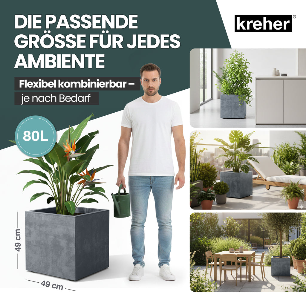 Kreher Pflanzkübel 'Millennium' | Praktisches 2er Set | Maße 80 Liter Eckig (BxTxH): 49 x 49 x 49 cm | Mit Wasserspeicher & Entwässerungsstopfen | 80 Liter Modelle rollbar | Material: UV-beständiger, frostsicherer Kunststoff | Für Indoor & Outdoor | Design: Naturstein-Optik | Farbe: Grau