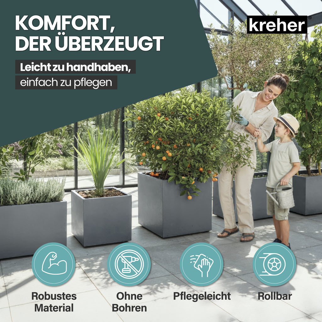 Der Kreher Pflanzkübel 'Millennium' vereint modernes Design mit durchdachter Funktionalität und ist die perfekte Wahl für Garten, Terrasse oder Balkon. Je nach Modell bietet der großzügige Pflanzkasten 80 Liter Volumen - ideal für Blumen, Pflanzen, kleine Sträucher oder dekorative Arrangements.