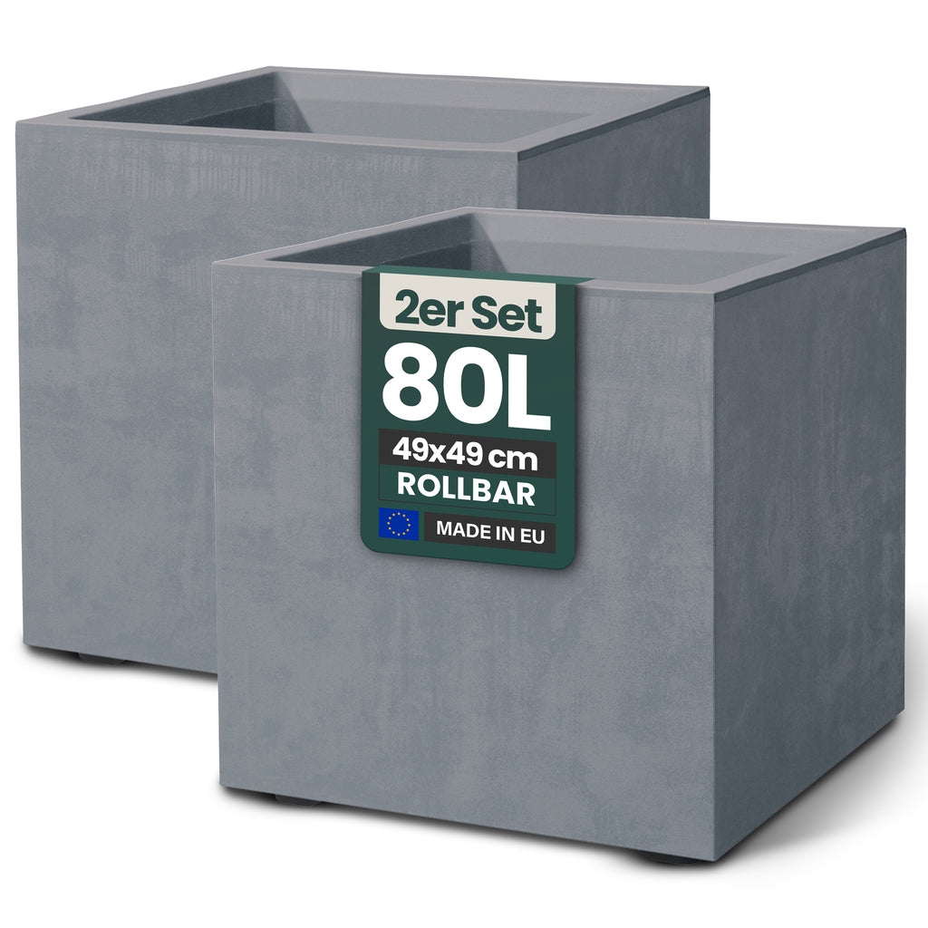 Je nach Platzbedarf und Bepflanzung stehen verschiedene Größen zur Auswahl: 40 Liter eckig (ca. 39 x 39 x 39 cm), 80 Liter eckig (ca. 49 x 49 x 49 cm), 48 Liter rund (Ø ca. 43 cm, Höhe ca. 53 cm) sowie 80 Liter rund (Ø ca. 59 cm, Höhe ca. 49 cm). Besonders praktisch: Die 80-Liter-Modelle, ob rund oder eckig, sind mit integrierten Rollen ausgestattet und lassen sich somit mühelos verschieben – ideal für den saisonalen Standortwechsel.
