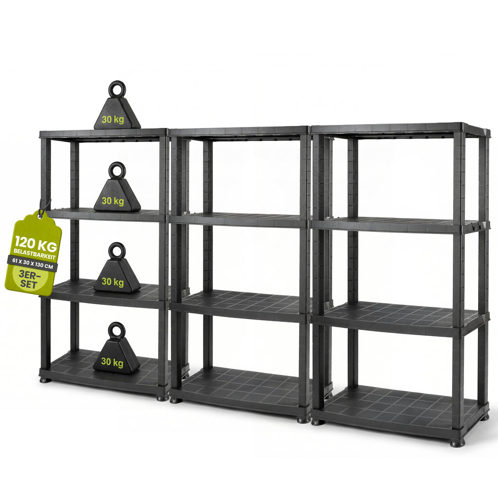 3 x Kunststoffregal „Neo“ mit 4 Böden - 30 kg pro Boden - Schwarz
