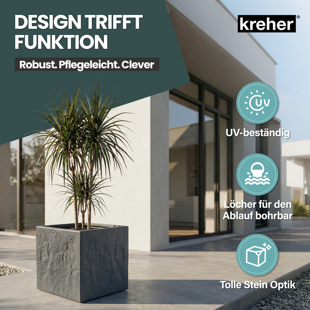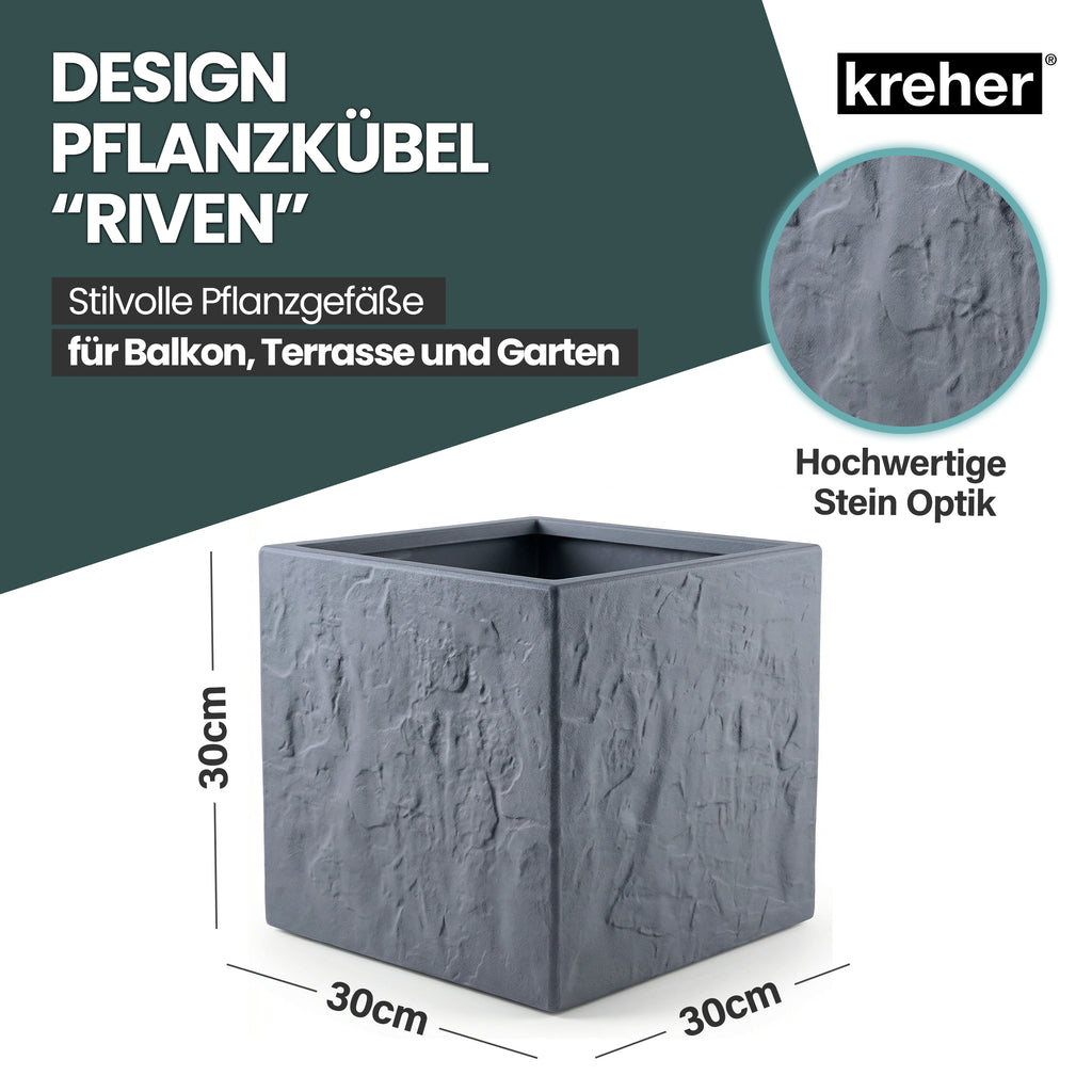 ALLE INFO'S - Artikel: 2 Stück Pflanzkübel 'Riven' | Maße (BxTxH): 30 x 30 x 30 cm | Farbe: Anthrazit | Material: Robuster Kunststoff | Oberfläche: Matt, moderne Stein-Optik | UV-beständig & wetterfest | Vorrichtung für optionalen Wasserablauf (nicht vormontiert) | Für Innen- & Außenbereich geeignet | Pflegeleicht, langlebig & stabil