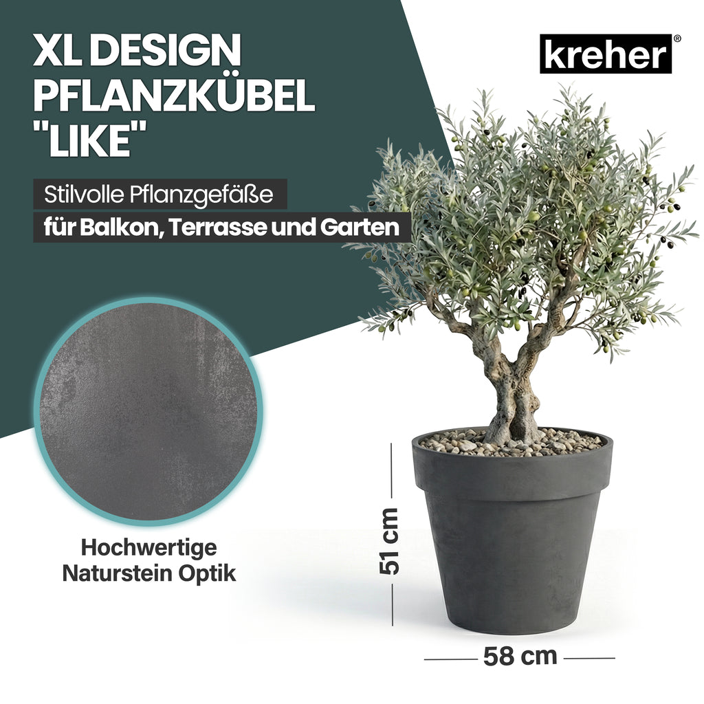 ALLE INFO'S - XL Pflanzkübel 'LIKE' | Maße (ØxH) in cm: 58 x 51 cm | Volumen: 90 Liter | Material: Robuster Kunststoff | Rollbar [optional zu montieren] | Farbe: Anthrazit | Mit Entwässerungsstopfen | Moderne Naturstein Optik | Pflegeleicht, abwaschbar und leicht zu reinigen | UV- und Witterungsbeständig | Wetterfest, Rostfrei | In- und Outdoor