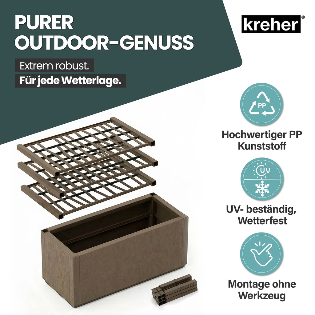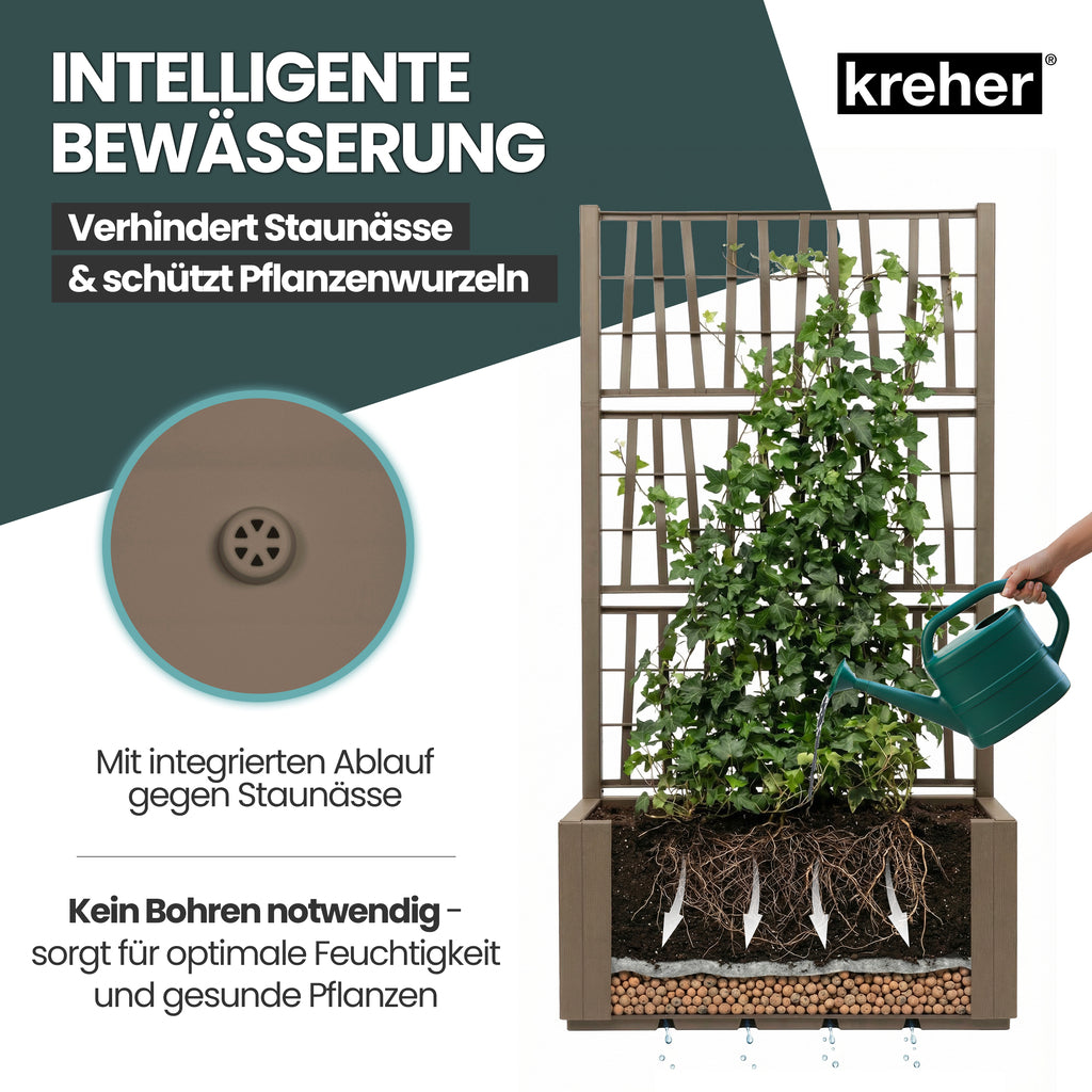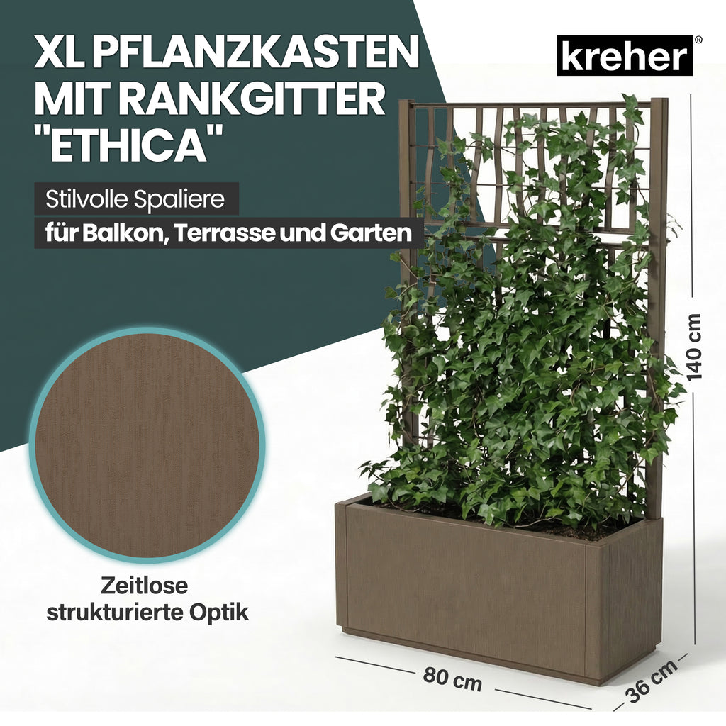 Entdecken Sie mit unserem XL Rankgitter und integriertem Pflanzkasten aus robustem Kunststoff eine vielseitige und elegante Möglichkeit, Ihren Außenbereich zu verschönern! Mit großzügigen Maßen von 80 x 36 x 140 cm und einem großzügigen Volumen von ca. 70 Litern bietet unser Pflanzkasten ausreichend Platz für eine Fülle von Pflanzen, Blumen und Kräutern, um Ihre persönliche grüne Oase zu schaffen.