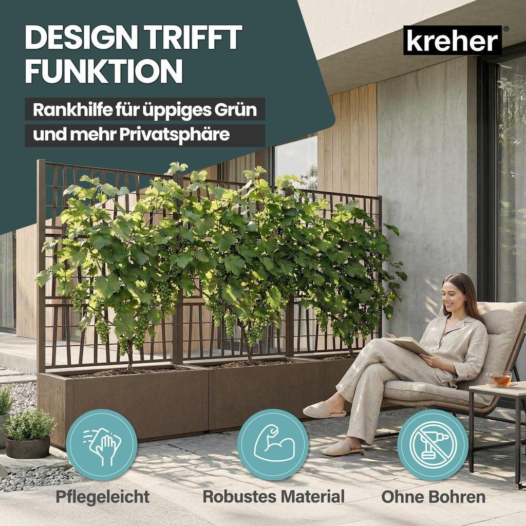 STRUKTURIERTES DESIGN FÜR ELEGANZ - Das strukturierte Design verleiht dem Pflanzkasten und dem Rankgitter eine edle Optik und lässt ihn modern wirken. Die dezente Farbgebung in Beige, Anthrazit, Olive Grün oder Taupe fügt sich harmonisch in verschiedene Garten- oder Balkonstile ein und schafft eine attraktive Kulisse für Ihre Pflanzen.