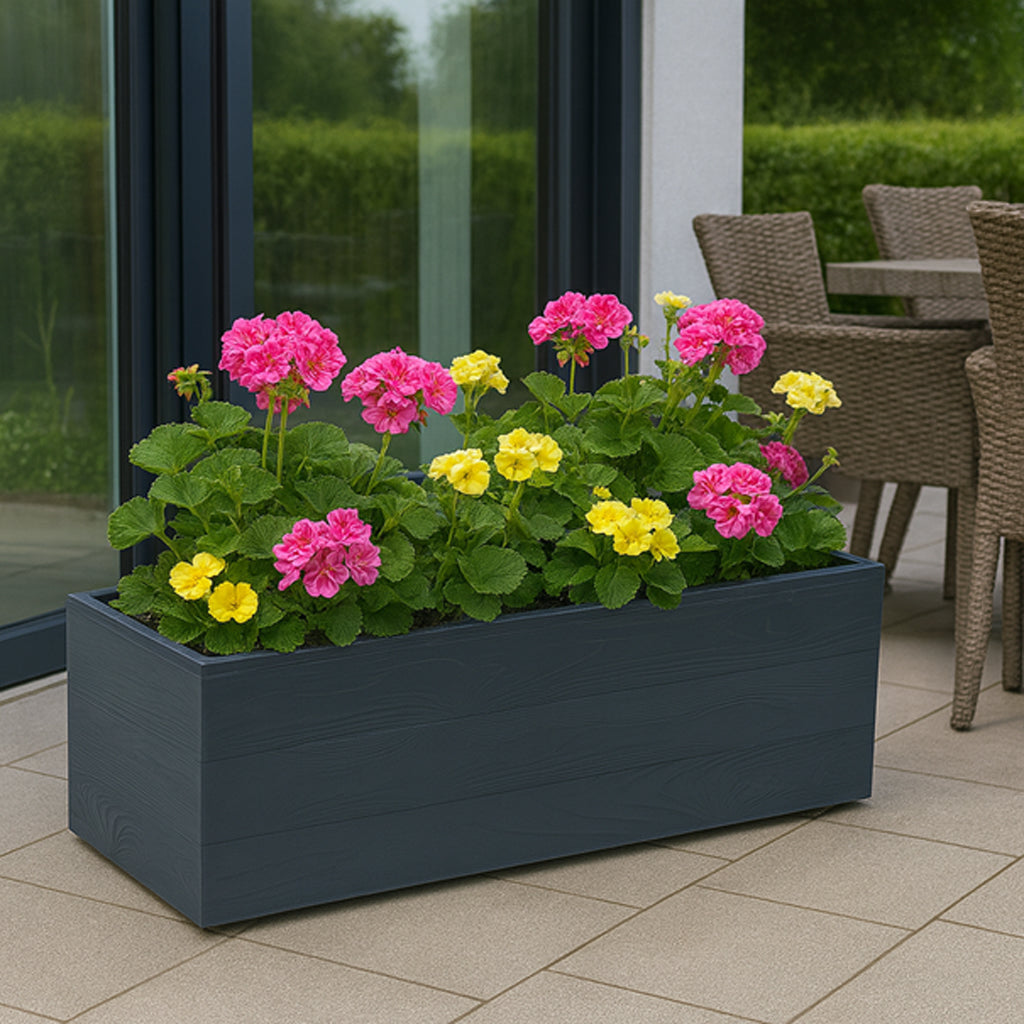 Kreher XL Pflanzkasten | Außenmaß (BxTxH): ca. 86 x 29 x 29 cm | Material: Hochwertiger, UV-geschützter Kunststoff | Design: Holz-Optik | Farbe: Anthrazit | Ausstattung: Integrierter Wasserspeicher, Entwässerungslöcher mit Kappe, Rollen [optional montierbar] | Einsatzbereich: Indoor & Outdoor geeignet