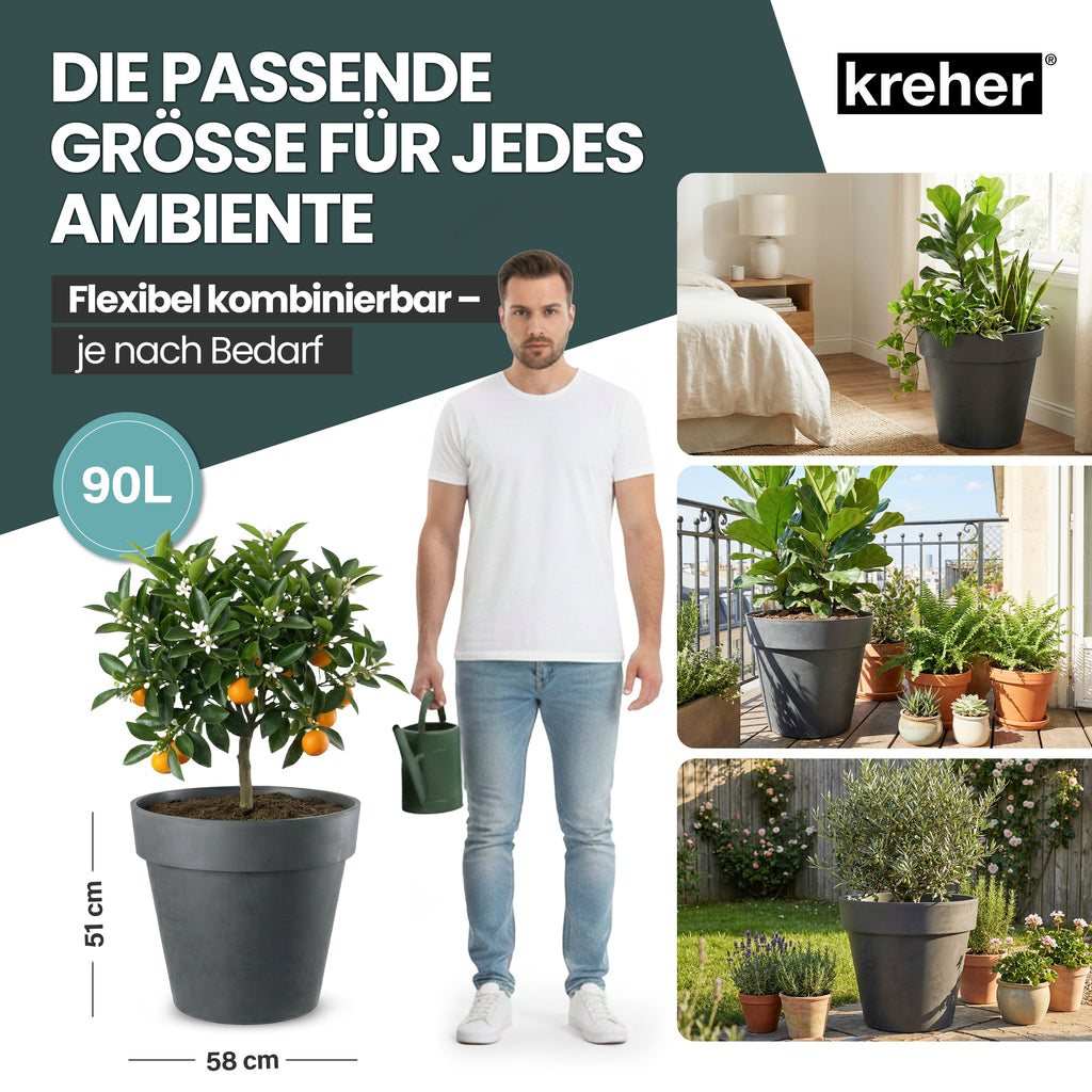 Mit einem großzügigen Fassungsvermögen von 90 Litern bietet der XL Pflanzkübel ausreichend Platz für vielfältige Bepflanzungen. Ob Blumen, Ziergräser, kleine Sträucher oder kreative Pflanzenarrangements – der Kübel schafft ideale Bedingungen für gesundes Pflanzenwachstum und dekorative Gestaltungsmöglichkeiten. Dank der optional montierbaren Rollen lässt sich der Pflanzkübel bei Bedarf einfach bewegen und flexibel platzieren.