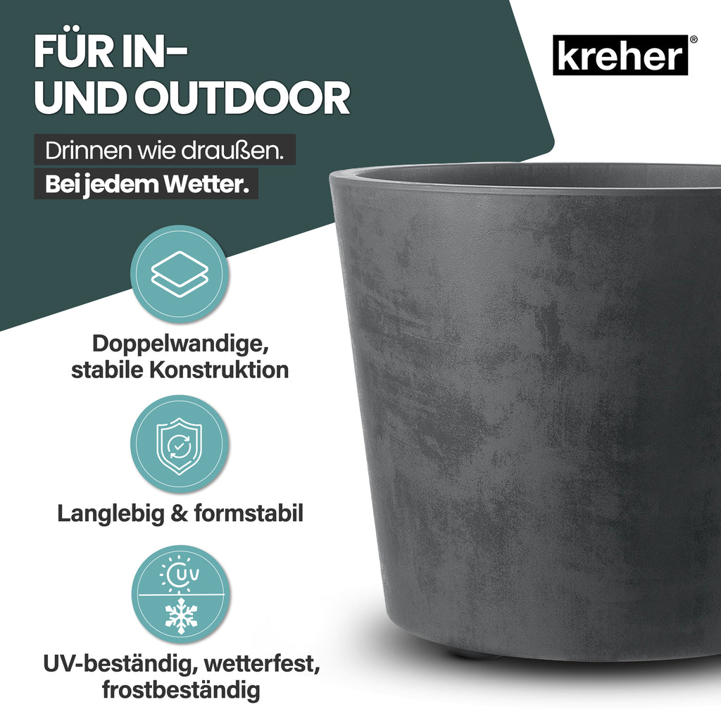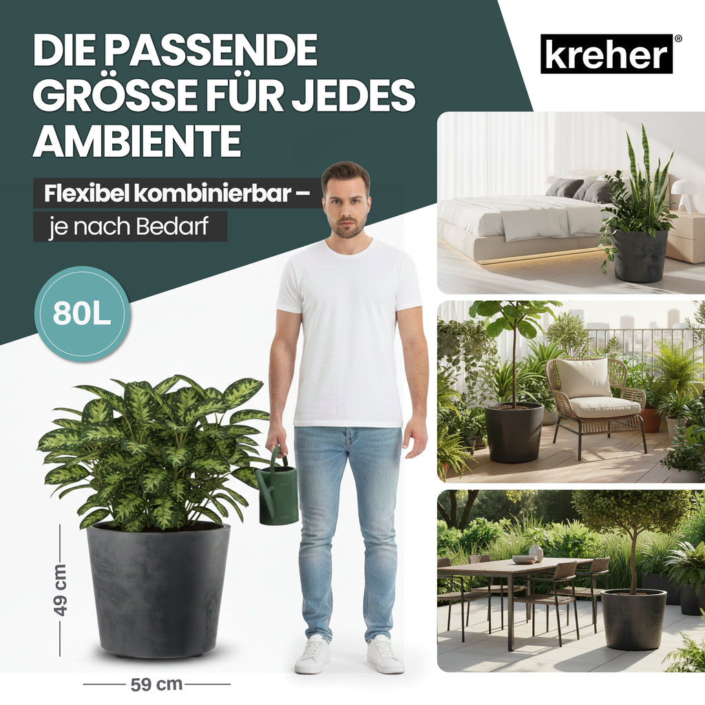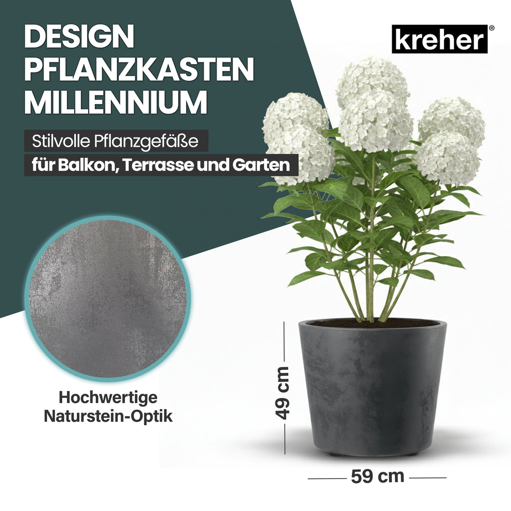 Kreher Pflanzkübel 'Millennium' | Praktisches 2er Set | Maße 80 Liter Rund (ØxH): 59 x 49 cm | Mit Wasserspeicher & Entwässerungsstopfen | 80 Liter Modelle rollbar | Material: UV-beständiger, frostsicherer Kunststoff | Für Indoor & Outdoor | Design: Naturstein-Optik | Farben: Anthrazit