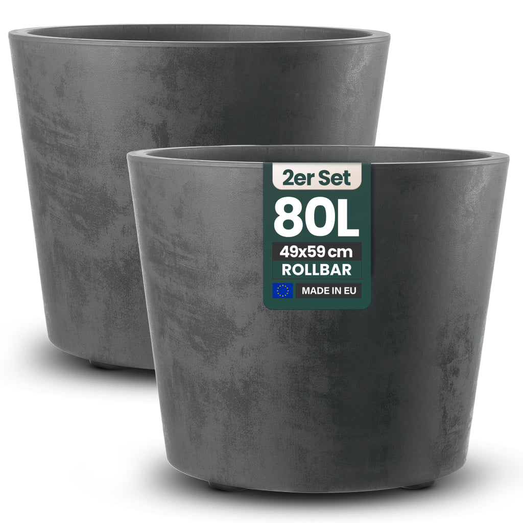 Je nach Platzbedarf und Bepflanzung stehen verschiedene Größen zur Auswahl: 40 Liter eckig (ca. 39 x 39 x 39 cm), 80 Liter eckig (ca. 49 x 49 x 49 cm), 48 Liter rund (Ø ca. 43 cm, Höhe ca. 53 cm) sowie 80 Liter rund (Ø ca. 59 cm, Höhe ca. 49 cm). Besonders praktisch: Die 80-Liter-Modelle, ob rund oder eckig, sind mit integrierten Rollen ausgestattet und lassen sich somit mühelos verschieben – ideal für den saisonalen Standortwechsel.