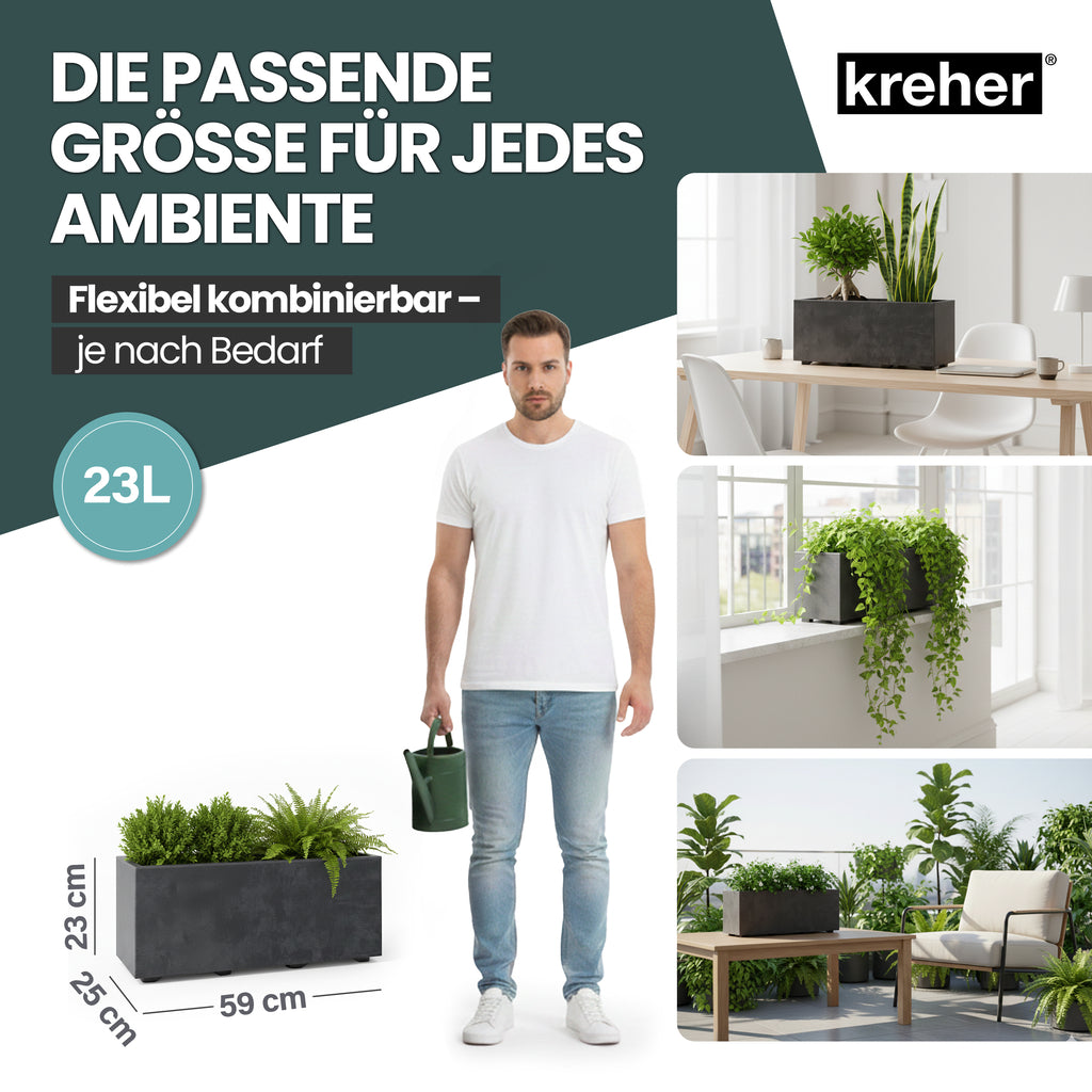 ALLE INFOS AUF EINEN BLICK - Volumen: ca. 23 Liter | Maße (BxTxH): 59 x 25 x 23 cm | Form: Rechteckig | Material: UV- & witterungsbeständiger Kunststoff | Oberfläche: Matt in Naturstein-Optik | Doppelwandig | Mit Entwässerungslöchern | Farbe: Anthrazit | Nutzung: Innen & Außen | Stabil, langlebig & pflegeleicht