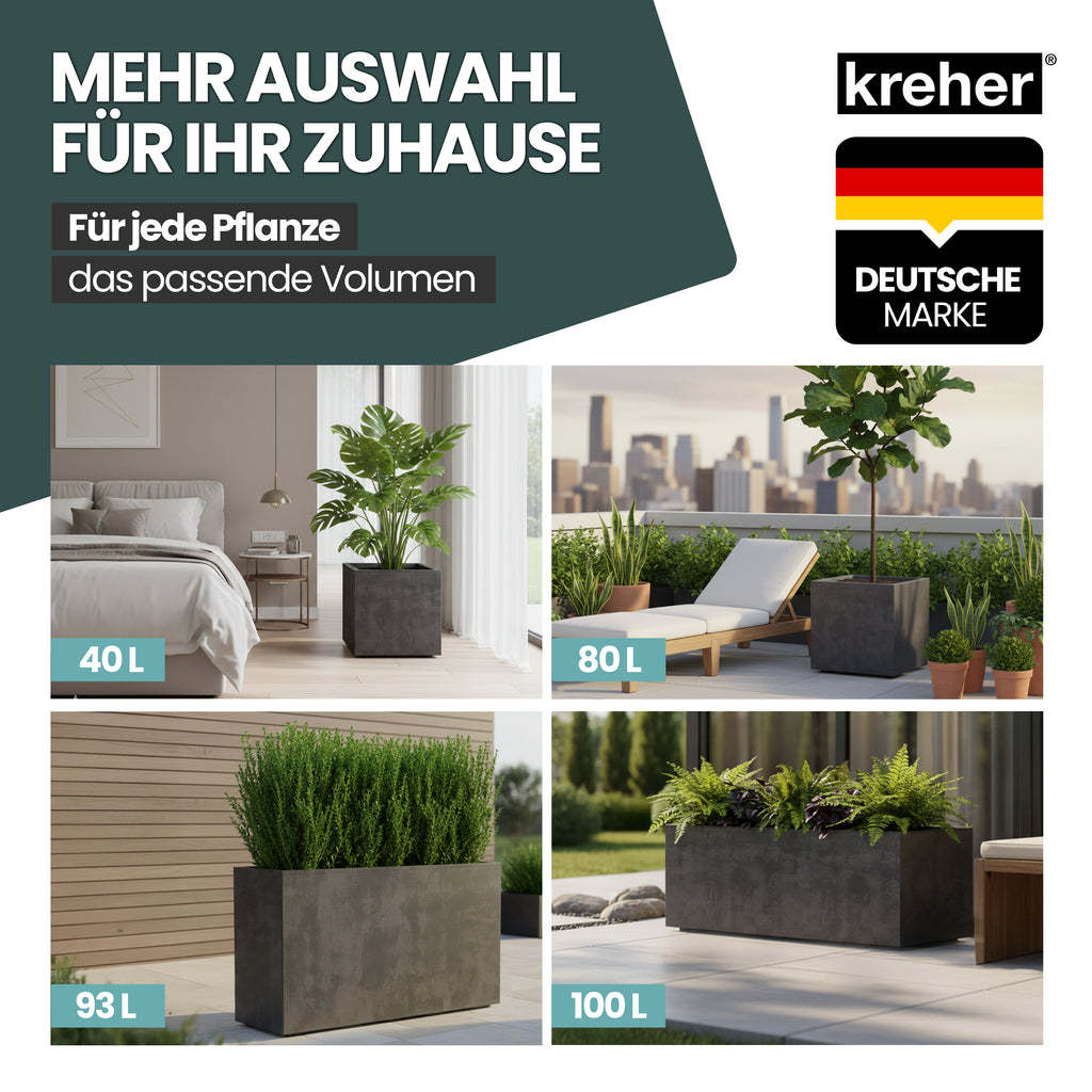 Entdecken Sie die Vielseitigkeit und Eleganz der Kreher XXL Pflanzkästen der Serie "Millennium"! Mit einer breiten Auswahl an Größen und Farben bieten sie eine perfekte Möglichkeit, Ihren Garten oder Ihre Wohnung zu verschönern. Die eckigen Modelle sind in 40 Liter (39 x 39 x 39 cm) und 80 Liter (49 x 49 x 49 cm) erhältlich, während die rechteckigen Varianten 73 Liter (78 x 39 x 39 cm) und 100 Liter (99 x 37,5 x 37,5 cm) fassen.