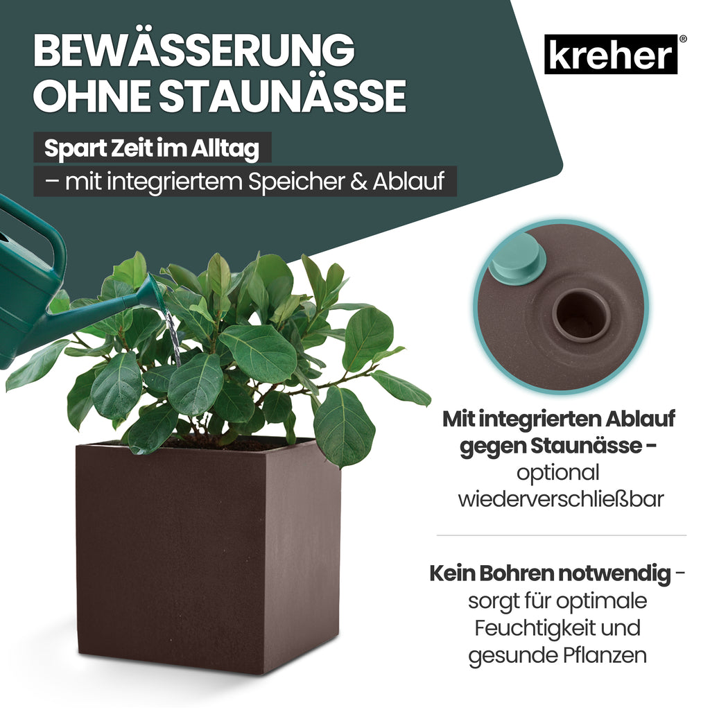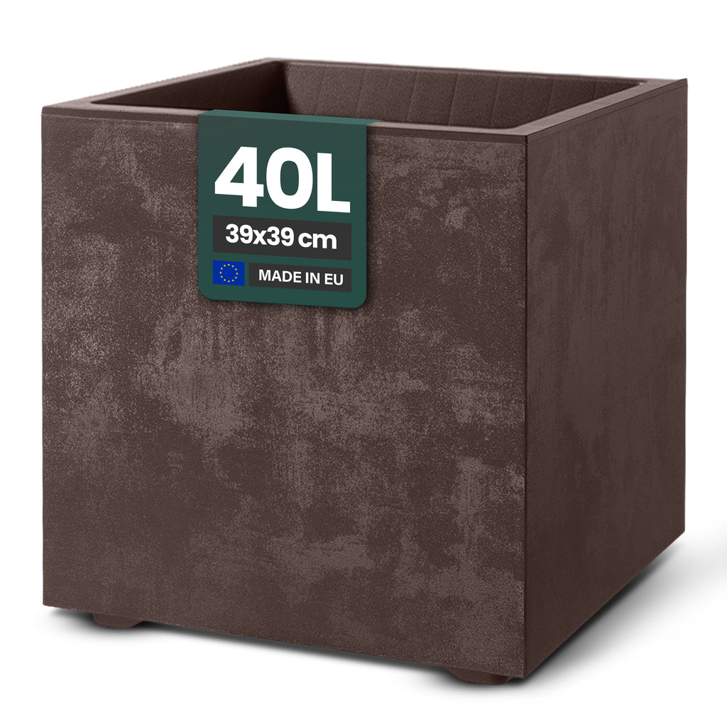ALLE INFOS AUF EINEN BLICK - Volumen: ca. 40 L | Maße (BxTxH): 39 x 39 x 39 cm | Material: Kunststoff (UV- & witterungsbeständig) | Oberfläche: matt in Naturstein-Optik | Doppelwandig | Mit Entwässerungsstopfen | Farbe: Braun | Nutzung: Innen & Außen | Pflegeleicht & langlebig