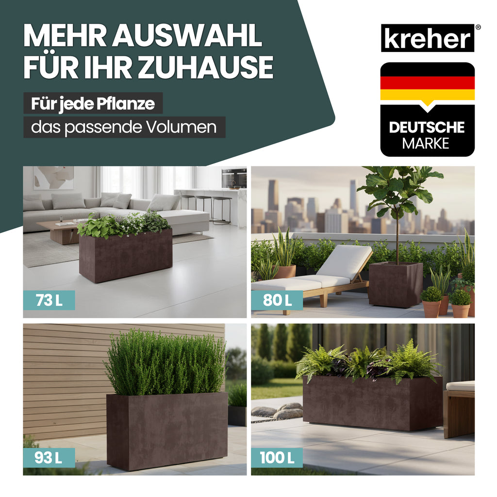 Entdecken Sie die Vielseitigkeit und Eleganz der Kreher XXL Pflanzkästen der Serie "Millennium"! Mit einer breiten Auswahl an Größen und Farben bieten sie eine perfekte Möglichkeit, Ihren Garten oder Ihre Wohnung zu verschönern. Die eckigen Modelle sind in 40 Liter (39 x 39 x 39 cm) und 80 Liter (49 x 49 x 49 cm) erhältlich, während die rechteckigen Varianten 73 Liter (78 x 39 x 39 cm) und 100 Liter (99 x 37,5 x 37,5 cm) fassen.