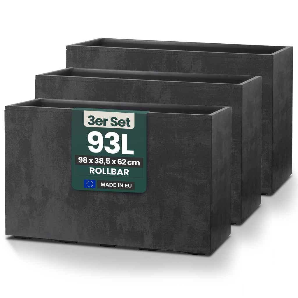 ALLE INFOS AUF EINEN BLICK - Volumen: ca. 93 L | Maße: 98 x 38,5 x 62 cm | Material: Kunststoff, UV- & witterungsbeständig | Doppelwandig & rollbar | Mit Entwässerungsstopfen | Farbe: Anthrazit | Nutzung: Innen & Außen | Pflegeleicht und robust.