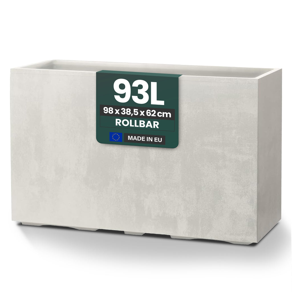 ALLE INFOS AUF EINEN BLICK - Volumen: ca. 93 L | Maße: 98 x 38,5 x 62 cm | Material: Kunststoff, UV- & witterungsbeständig | Doppelwandig & rollbar | Mit Entwässerungsstopfen | Farbe: Creme Weiß | Nutzung: Innen & Außen | Pflegeleicht und robust.