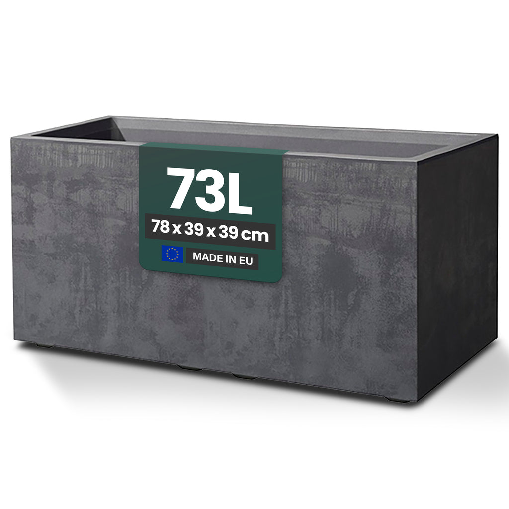 ALLE INFOS AUF EINEN BLICK - Volumen: ca. 73 L | Maße (BxTxH): 78 x 39 x 39 cm | Material: Kunststoff (UV- & witterungsbeständig) | Oberfläche: matt in Naturstein-Optik | Doppelwandig | Mit Entwässerungsstopfen | Farbe: Anthrazit | Nutzung: Innen & Außen | Stabil, langlebig & pflegeleicht
