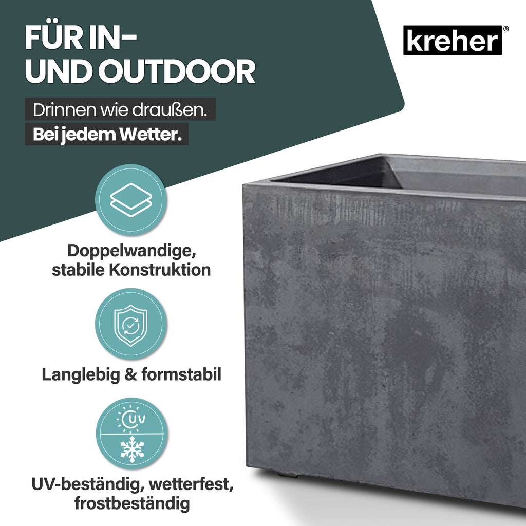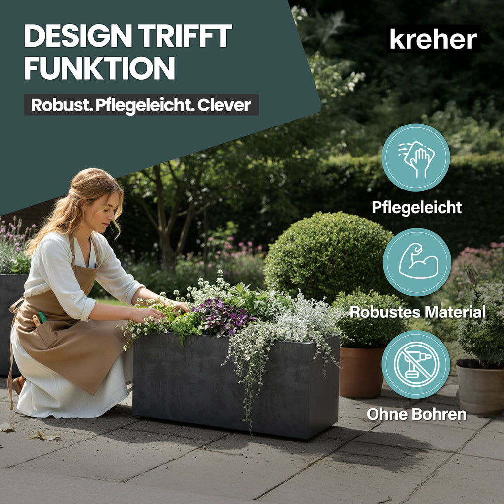 Entdecken Sie die Vielseitigkeit und Eleganz der Kreher XXL Pflanzkästen der Serie "Millennium"! Mit einer breiten Auswahl an Größen und Farben bieten sie eine perfekte Möglichkeit, Ihren Garten oder Ihre Wohnung zu verschönern. Die eckigen Modelle sind in 40 Liter (39 x 39 x 39 cm) und 80 Liter (49 x 49 x 49 cm) erhältlich, während die rechteckigen Varianten 73 Liter (78 x 39 x 39 cm) und 100 Liter (99 x 37,5 x 37,5 cm) fassen.
