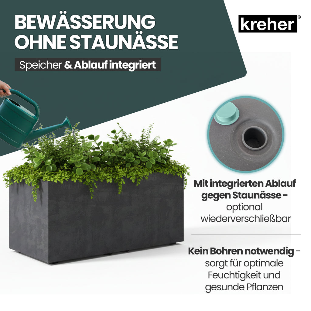 Egal, ob Sie lebendige Blumen, üppiges Grün oder eine elegante Bepflanzung wünschen, die Kreher XXL Pflanzkästen der Serie "Millennium" bieten die perfekte Leinwand für Ihre botanischen Meisterwerke. Gönnen Sie sich diesen stilvollen und funktionalen Akzent für Ihren Garten oder Ihr Zuhause und genießen Sie die Schönheit und Vielseitigkeit dieser erstklassigen Pflanzkästen!