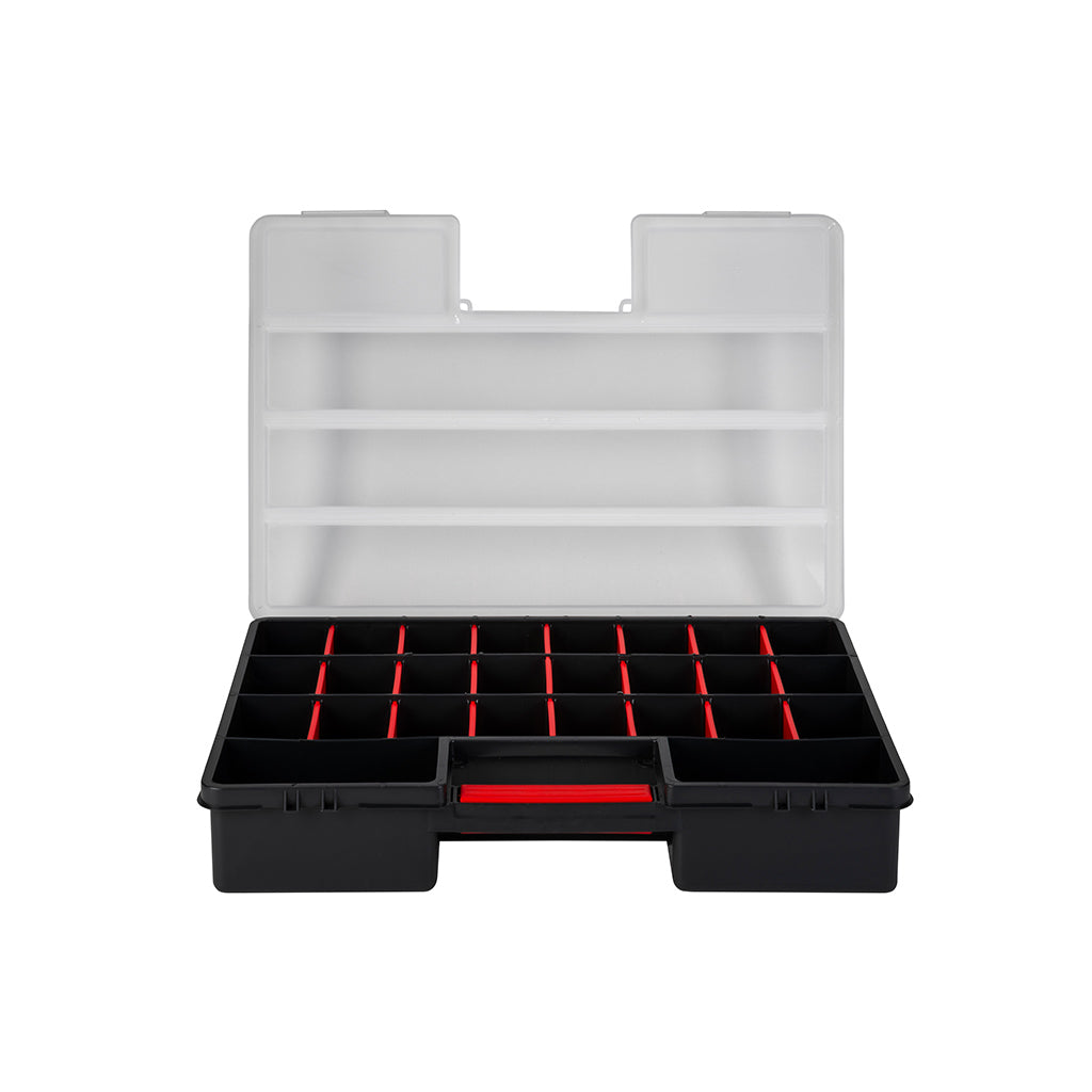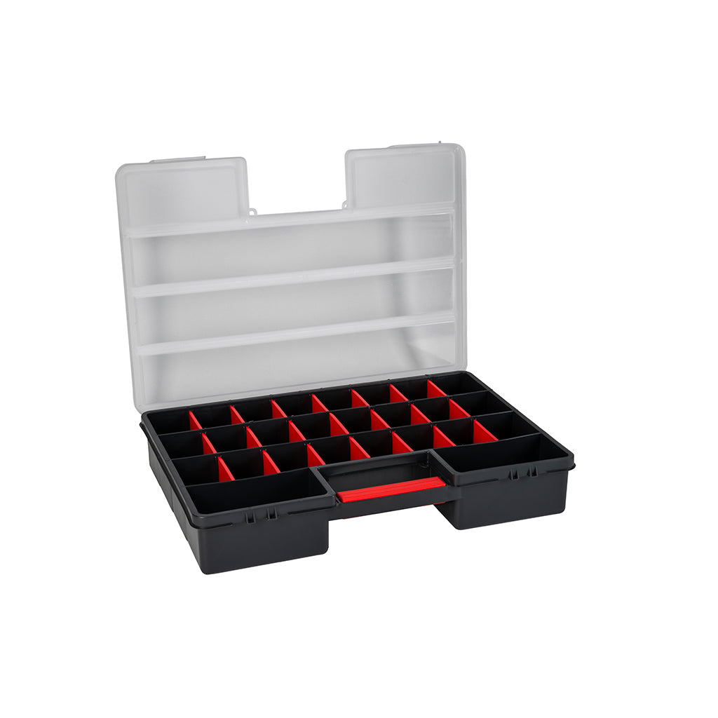 Transparenter Deckel für sofortigen Einblick in den Inhalt. Organisieren Sie mühelos Kleinteile, Werkzeug, Schmuckzubehör oder Kosmetikartikel.