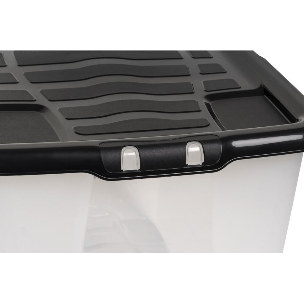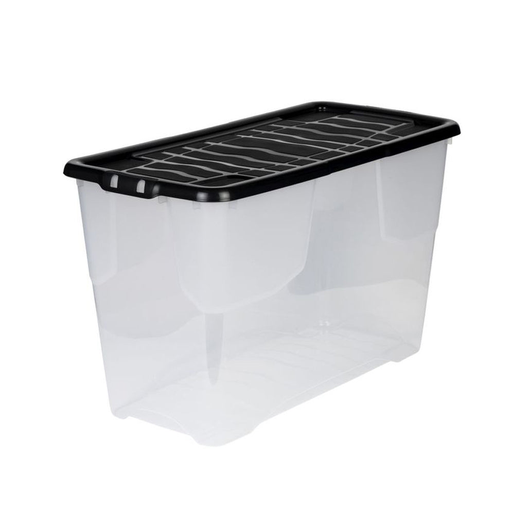 Außenmaß ca.: 80 x 40 x 48 cm. Innenmaß ca.: 74 x 35 x 47 cm, 100 Liter. Kunststoff, transparent mit schwarzem Deckel, multifunktional.